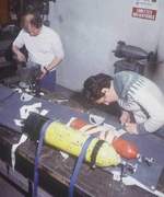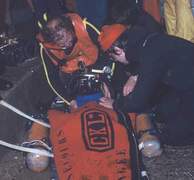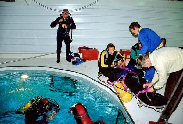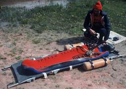 Le transport de la civière fut également revu. On avait constaté de gros problèmes avec les servants avants (les deux plongeurs qui dirigent le brancard sur l’avant), en combinaison humide et sans système d’équilibrage. L’équilibrage de l’attelage était assuré avec le sac étanche (dans lequel est placé le blessé), avec l’inconvénient de propulser le brancard au plafond dès lors qu’un plongeur lâchait la civière pour gérer son matériel ou sa plongée. |