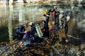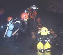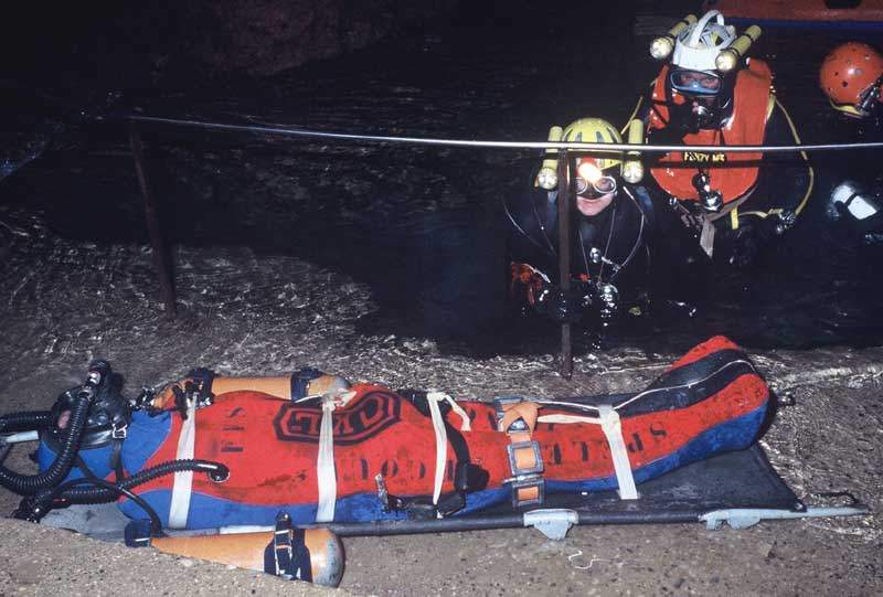 A la fin des années 70, l’équipe de la commission plongée de la Fédération Française de Spéléologie, en collaboration avec le Spéléo-Secours Français, s’est penchée sur les problèmes d’évacuation d’un poly-traumatisé post-siphon. Des essais avaient été réalisés dès 1977 dans le Jura (http://www.juraspeleo.com/cdsinfo/archives/info_176.htm). Les Rhône-alpins Daniel Andres et Jean-Luc Thevenin, premiers instigateurs d’un projet de sac étanche monté sur une civière, avaient pris contact avec l’équipe des Plongeurs Spéléo de Paris. |