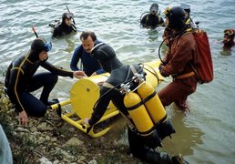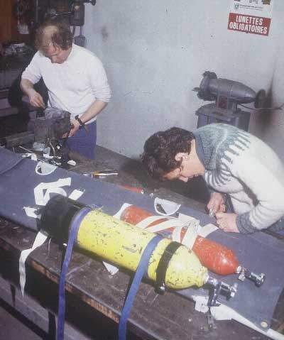 Cette équipe soudée de passionnés comptait trois plongeurs expérimentés (15 à 17 ans de pratique, dont un moniteur national), et ils enseignaient tous la plongée depuis une dizaine d’années. Ils disposaient d’une solide formation en mécanique et électro-mécanique (on retiendra la fabrication de side-cars, avec trois titres de champions de France) et étaient complémentaires des autres plongeurs, qui maîtrisaient la spéléologie. A la fin des années 70, ils se retrouvent en charge du développement d’un sac étanche monté sur une civière, pour répondre aux spécificités d’un éventuel sauvetage d’un accidenté post-siphon. |
