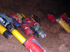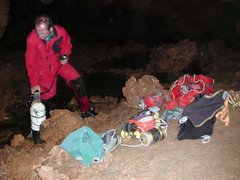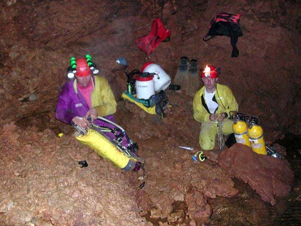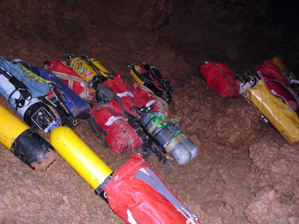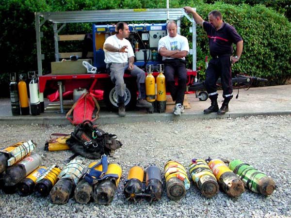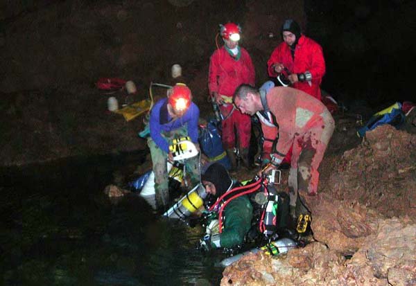 Mercredi 6 juin 2001-Situation à 09 H 00 L'équipe de plongeurs spéléologues et leurs accompagnateurs sont entrés dans la grotte à 7 H 00. Ils s'immergeront dans le 1er siphon vers 10 H 30 et ils auront environ 2 H de progression pour arriver au bord du siphon 6. L'équipe est prête à répondre à tous les cas de figures qui se présenteront. Sont prêts à intervenir :