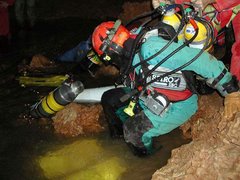 Mercredi 6 juin 2001-Situation à 15 H 50 Le plongeur vient d'être retrouvé vivant dans une poche d'air. Patrick Mugnier a été retrouvé vivant. Un médecin spéléo-plongeur va se rendre vers lui pour médicaliser et préparer la sortie. Mercredi 6 juin 2001-Situation à 17 H 50 Le spéléologue disparu a été retrouvé vivant à fleur d'eau sur un rocher. Il est conscient mais a du mal à respirer. Mercredi 6 juin 2001-Situation à 20 H 00 Au vu de la situation critique, l'équipe de plongeurs-spéléologues, en relation avec les Conseillers Techniques en surface, ont décidé, toutes considérations de sécurité et de santé requises, de faire franchir à Patrick Mugnier le siphon 6. Il est actuellement installé dans un point chaud entre le siphon 5 et le siphon 6, pour attendre l'arrivée du médecin. Dès que Bernard Gauche, Médecin spéléo-plongeur du SSF qui actuellement progresse vers lui, aura donné un avis favorable tout sera mis en oeuvre pour assurer son évacuation. Jeudi 7 juin 2001-Situation à 07 H 00 Bernard Gauche spéléo-plongeur du SSF, médecin (spécialisé hyperbare) est arrivé à 00 H 30 au point chaud où se situe Patrick Mugnier. L'état de ce dernier s'améliore d'heure en heure. Il marche, se réhydrate et récupère sa température vers la normale. Lorsque Frank Vasseur (spéléo-plongeur du SSF) l'a découvert, Patrick Mugnier était allongé et avait des difficultés respiratoires, la poche d'air était saturée en CO2 dégagé par le plongeur. Après discussion, il s'est avéré impératif pour ces deux plongeurs de ressortir entre le siphon 6 et le siphon 5. Le point le plus bas à franchir étant de - 20 mètres. Une fois sortie du siphon 6, ils se retrouvent au point chaud prévu à cet effet. Bernard Gauche l'ausculte actuellement et fera dans les heures à venir un bilan médical. Suite à ce bilan, le médecin pourra définir les conditions et l'heure de départ de l'évacuation. Suffisamment de plongeurs-spéléologues (30) sont sur place ainsi que de spéléologues (20), afin d'organiser cette évacuation avec la sécurité requise pour tous. Jeudi 7 juin 2001-Situation à 17 H 50 17h50 Bilan de santé par le médecin dans le VSAB : Excellent état physique et physiologique, Patrick Mugnier a subi dimanche un accident de décompression articulaire et il est actuellement sous oxygène pur. Il va être transféré par hélicoptère SAMU 34 vers la clinique St-Pierre à Perpignan (caisson hyperbare). Jeudi 7 juin 2001-18 H 00 Fédération Française de Spéléologie Communiqué à l'AFP Le bureau de la Fédération Française de Spéléologie (FFS) apprend avec plaisir et soulagement l'heureuse issue du sauvetage de Patrick Mugnier dans le gouffre de Fontanilles à Puéchabon (Hérault). Nous exprimons nos remerciements à tous les sauveteurs et plongeurs du Spéléo-Secours Français, commission de la FFS, ainsi qu'à tous les autres participants à cette opération de secours, bénévoles et corps constitués, qui ont contribué avec efficacité et dévouement à ce résultat. Patrick Mugnier, qui fait partie des meilleurs plongeurs souterrains du moment, compte à son actif d'importantes découvertes et explorations et contribue au développement des techniques de plongée profonde en spéléologie. Pour autant, la Fédération Française de Spéléologie ne peut cautionner le fait qu'une équipe se soit engagée dans cette exploration en ignorant la réglementation locale. Lorsque les circonstances le justifient, la Fédération Française de Spéléologie contribue en partenariat avec les collectivités ou les propriétaires privés à mettre en place des procédures de limitation ou de contrôle d'accès. En dehors de ces cas particuliers, la FFS souhaite réaffirmer son attachement à un libre accès aux sites de pratique et s'opposer aux mesures d'interdictions injustifiées. La Fédération Française de Spéléologie rappelle qu'elle intime à ses membres de respecter scrupuleusement les réglementations en vigueur. Sauvetage aux Fontanilles à quatre mains Article goupillé à partir de deux publications : « Secours aux Fontanilles » par Jean-Pierre Baudu (CDS 42 - Commission plongée souterraine) Photographies : Robert BOURRIER (Spéléo-Secours de l'Hérault). Jean-Pierre : Nous sommes le lundi 3 juin 2001, je reçois un message sur mon portable, c'est Fabien Darne. La nouvelle tombe : un plongeur n'est pas ressorti de la grotte des Fontanilles. Depuis 2 ans, Frank Vasseur a repris les explorations dans cette cavité. Son but est de poursuivre l'exploration du S6, au-delà de son précédent terminus à –77m. Il met en route une grosse organisation. Connaissant bien Frank, ce qui prime c'est la sécurité à toutes les étapes du processus. Beaucoup de copains sont là pour lui donner un coup de main. c 'est l'occasion pour beaucoup de découvrir cette superbe cavité dont l'accès est réglementé. Les relations de Frank avec les pouvoirs publics, les chasseurs et les protecteurs de la nature, l'ont amené sur un terrain d'entente collectif. L'exploration se fera en plusieurs étapes. En février et mars 2000, nous préparons les bivouacs post siphon et nous acheminons des échelles en alu jusqu'au S6 (1100m) pour le franchissement d'escalades délicates avec des bouteilles de plongée. Je participe à deux plongées. La deuxième plongée, nous permet Frank, Medhi et moi de rejoindre le S6. Rares sont les personnes qui ont nagé dans ce magnifique lac. Quelques mois plus tard, Frank m'appelle pour me demander si je veux être le plongeur qui l'accompagnera au S6 et qui passera la nuit au bivouac, lors de la pointe. Pour moi, c'est un honneur. Bien sûr, j'accepte et me fais un plaisir de préparer mon duvet conditionné dans un sac étanche pour passer les différents verrous liquides. Seulement, le début de l'année 2001 commence très mal, tempêtes, pluies, inondations… Le moral de Frank est au plus bas. Nous avion