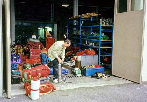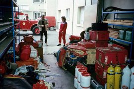 Quelques précisions sur l'opération et des renseignements administratifs ponctuent la matinée. La confirmation de départ ne donne le feu vert qu'aux alentours de 12h 30. Le regroupement se déroule au Centre de Secours Principal de Dijon, comme pour les sauvetages précédents (Pologne, Suisse etc...). L'équipe se compose, cette fois de seize membres d'origines et de milieux professionnels divers ( plombier, enseignant, médecin, maçon etc...) tous réquisitionnés par le ministère de l'Intérieur. Un seul lien nous unit, la spéléo plongée et l'esprit de solidarité qui en découle.