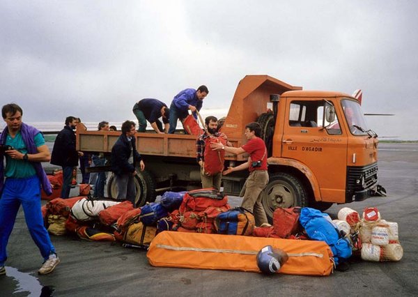 Un accueil chaleureux nous attend à l'aéroport d'Agadir, où le traditionnel thé à la menthe nous est servi. Le matériel est chargé dans des " Land Rover", et sur deux camions.