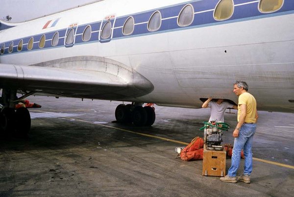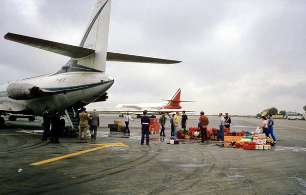Le matériel s'amoncelle au milieu de la cour au fur et à mesure de l'arrivée de l'équipe. Trente mètres cubes pour un poids de trois tonnes nous laissent entrevoir quelques problèmes de transport !.. Après un retard d'ordre technique, un avion de type "Caravelle" se pose sur l'aérodrome de Dijon-Longvic. Le chargement s'effectue dans la soute à bagage d'un volume de 6 m3, et le reste trouve sa place, ficelé entre les sièges des passagers. Ce n'est que vers 21 h 30 que nous quittons le sol dijonnais pour Agadir.