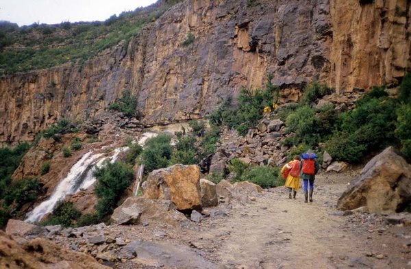 Puis l'équipe monte à bord de petits véhicules tous terrains. Trente kilomètres de route défilent sans encombre. A un carrefour, nous bifurquons pour prendre une piste. Vingt kilomètres nous séparent encore de la cavité. La pluie redouble !... La couleur rouge de la terre recouvre les véhicules. De profondes ravines entrecoupent le chemin. La voiture de tête franchit un Oued à gué, qui, en temps ordinaire, doit ressembler à un mince filet d'eau se faufilant entre les galets.