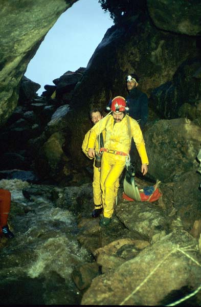 L'équipe médicale reste sur place. II est 21 h 00 quand nous replongeons, Bernard LEBIHAN et moi, chargés de vivres et d'éclairage, à l'abri dans des containers étanches. Que se passe t'il dehors ? La pluie a-t-elle redoublé ? Qu'importe, il nous reste encore une heure pour progresser plus avant. Sans encombre, nous franchissons la portion de galerie noyée et atteignons le point terminal du fil d'Ariane. Au bout d'une cinquantaine de mètres de progression aquatique, une cascade nous barre la route. De toute évidence le passage se situe à la base de celle ci. Malheureusement un courant violent nous empêche d'y accéder. II faudra la contourner en empruntant un endroit escarpé.