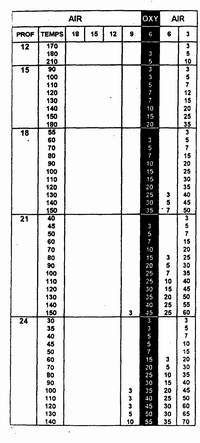 Si, dans les tables Air Standard, Air/Oxy/6m et Air/Oxy/12m, le temps équivalent correspond à une décompression avec une remontée sans palier, effectuer cependant un palier de sécurité de 3 minutes à 3 mètres.
