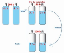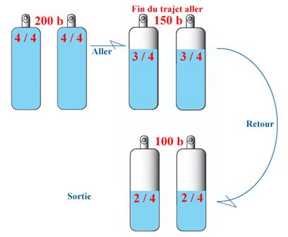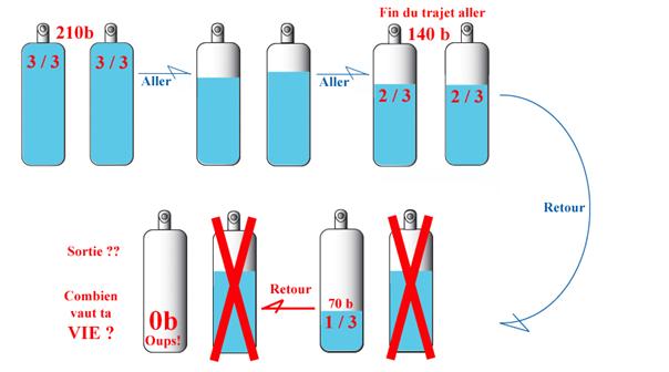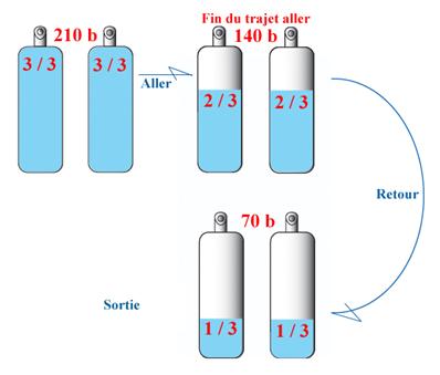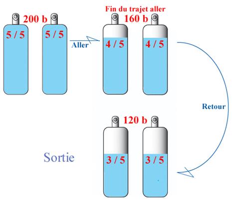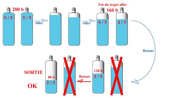 Lors d'un problème survenant au point le plus éloigné de l'entrée (c'est à dire lors du demi-tour), le plongeur finit la plongée sur une bouteille et dispose de 2/5 de gaz pour rentrer.