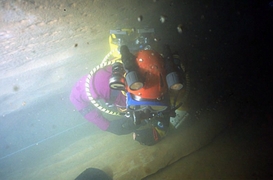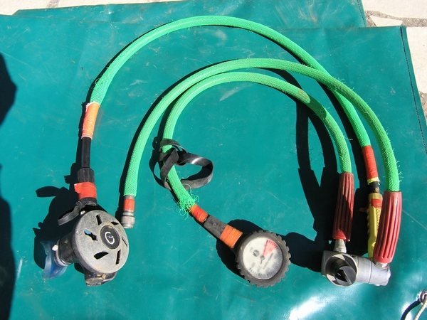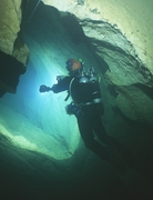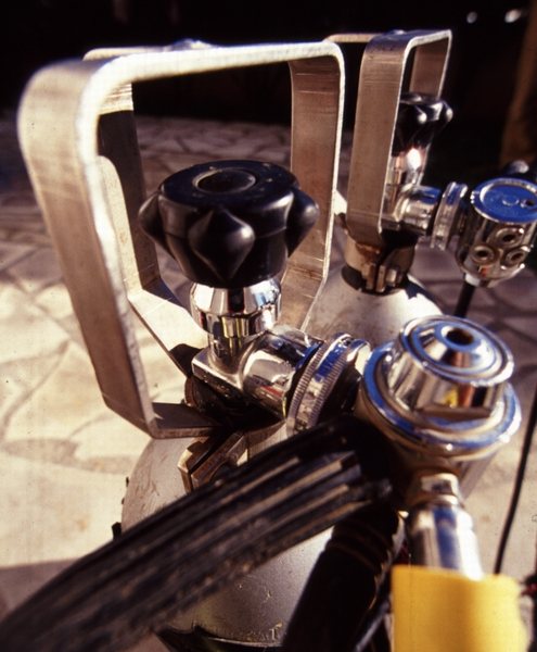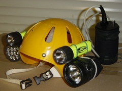 La profusion et la lourdeur, relatives par rapport à la configuration de base du plongeur sous-marin, de l'équipement du plongeur souterrain choquent souvent le néophyte. L'équipement classique Composé de matériel « standard » de plongée, il est amélioré, adapté, configuré pour la plongée souterraine. Le masque Un second masque (de secours) pourra s'avérer utile. Il peut être porté sur le biceps, sur la nuque, sur le casque, dans une pochette de secours ou ailleurs. L'important étant de le trouver puis d'en disposer rapidement en cas de nécessité. Les palmes Pour s'affranchir des problèmes de boucles qui cassent ou se dérèglent, ainsi que des ruptures de sangles, il est judicieux de remplacer le tout par du sandow ou un ressort métallique fixé sur des boucles métalliques ou des anneaux percés. Pour plus de détails, voir article sur les palmes, sur ce site La Combinaison La durée de vie de la combinaison humide sera considérablement accrue si on lui associe une sur-combinaison toilée (type combinaison de spéléologie). la combinaison étancheTout est possible en la matière : toile, néoprène ou néoprène pré-comprimé, fermetures « tour de cou », « épaules-épaules » ou « épaule-hanche » , manchons et collerettes en latex ou néoprène. Il est impossible de préconiser un type de vêtement « idéal », dans la mesure où la température des siphons français varie de 4 à 18° C selon les régions et les périodes de l'année (fonte des neiges) et qu'il existe autant de possibilités diverses d'utilisation que de cavités. On retiendra tout de même que les vêtements en toile sont plus appropriés à la progression entre les siphons (plus souples), qu'il est préférable de limiter la masse de plomb à transporter pour compenser la flottabilité du vêtement, que l'isolation dépend presque autant de la qualité des sous-vêtements que du vêtement en lui-même. Un « gadget » a fait le bonheur de plus d'un plongeur souterrain : la purge-pipi, qui permet de se soulager à l'extérieur du vêtement. Elle autorise une hydratation adéquate lors des plongées. Elle demeure à ce jour réservée aux hommes, bien que des astuces aient été développées pour ces dames. Pour en savoir plus dans ce domaine : la purge pipi Les DétendeursLes modèles avec premier étage à membrane supportent généralement mieux la plongée en eaux chargées que ceux à piston (pas de joint qui travaille dans le sable ou l'argile). Il est quasiment acquis qu'on les accroche autour du cou. Une cordelette, un anneau de tuyau chirurgical ou de sandow en guise de « tour de cou » est fort utile pour accrocher les détendeurs à portée de main permanente, loin du sol (sable, argile). Cette disposition présente plusieurs avantages. Les deuxièmes étages ne traînent pas dans les sédiments, ni ne s'accrochent aux parois. Ils sont surtout disponibles immédiatement, sans nécessiter de recherche en cas de besoin. Certains marquent (ruban adhésif coloré) de la même couleur le manomètre et l'inflateur auxquels ils correspondent, à chaque extrémité du flexible (utile pour indiquer au collègue quel robinet fermer en cas de débit constant sur un détendeur) ou retrouver « ses petits » sans avoir à faire du tri en cas de problème. Les ManomètresChaque bouteille en est impérativement équipée. Le manomètre est marqué de la même couleur que le détendeur et l'inflateur auxquels il correspond. Ils doivent « tomber sous la main » (accessible aisément et sans avoir à chercher) car ils sont régulièrement consultés, demeurer près du corps pour ne pas pendouiller et s'accrocher partout. D'aucuns les accrochent ensemble sur le devant du corps (abdomen), d'autres au poignet avec des dragonnes, certains les solidarisent du détendeur, on peut aussi les faire « sortir » du même côté ou de part et d'autres du plongeur. L'éventail de possibilités est vaste et la configuration « universelle » reste à inventer. Les flexibles la gaine plastique torsadée (de type protection de câbles électrique) s'avère robuste et efficace, mais présente l'inconvénient d'incruster le sable dans le flexible. La raideur du matériau a tendance à rigidifier le tout au détriment de la souplesse du port du second étage en bouche. Le filet souple, distribué dans les échoppes de plongée, est plus fragile, mais plus souple et se rince aisément. Le matériel spécifique Le casque protéger des chocs Attention, la mousse qui rembourre certains casques s'écrase avec la pression et modifie le réglage de la taille en profondeur (bascule du casque sur le masque, en arrière ou sur un côté). Les rembourrages en polystyrène se compriment sous l'effet de la pression, et ne retrouvent plus leur volume initial après une incursion en profondeur. La jugulaire doit être aisément manipulable (ouverture / fermeture) – certains l'ont remplacée par un élastique robuste -, le casque ne doit pas piéger l'air (ouvertures dans la coque). Eviter les modèles trop proéminents. Certains se contentent d'une simple coque de casque d'eau-vive. L'éclairage Pour l'éclairage puissant, favoriser les modèles avec boyon : un pack de batteries porté à la ceinture. Il remplace avantageusement une partie du lestage. On trouve sur le marché plusieurs types d'ampoules, l'éternelle halogène, le HID (grande autonomie, belle luminosité mais fragile), la LED (très grande autonomie, pratiquement incassable).Là aussi comme la combinaison, à chacun de faire ses choix. Généralement, on fonctionne à l'économie et on allume rarement plus de deux lampes simultanément (mais au moins deux pour éviter de se retrouver dans le noir en cas de panne). Favoriser les interrupteurs manipulables d'une seule main et facilement accessibles (parce qu'on en a généralement une sur le fil d'Ariane). Dans certaines conditions (balade, grands volumes, propulseur) le port de la tête de phare sur le do