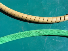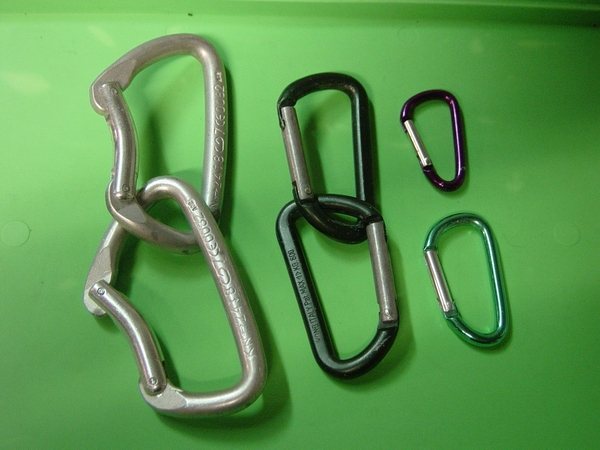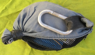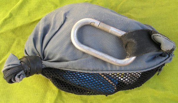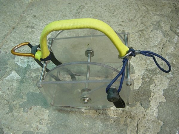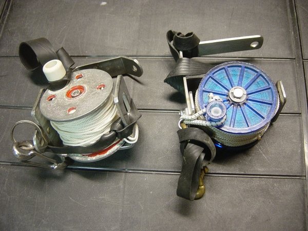 Nos collègues d'Outre-atlantique condamnent l'usage des mousquetons de type « montagne » car ils peuvent s'ouvrir tout seuls et emprisonner des éléments (boucles, sangles diverses, fil d'Ariane…etc.) à l'insu du plongeur. Le dévidoir Il faut éviter de le remplir au maximum et de serrer les spires, afin qu'en cas de rembobinage le fil occupe le même volume dans le dévidoir. Dans l'eau le fil a tendance à « gonfler » et occuper un volume plus important que quand il est sec. C'est pourquoi, une astuce consiste à laisser tremper le fil dans l'eau quelques heures avant de l'enrouler sur le dévidoir. Un dévidoir trop plein est dangereux, des spires risquent de s'échapper, de le bloquer et de le rendre inutilisable. Au vu du panel de tâches à effectuer, il est convenu que plusieurs modèles puissent être mis en œuvre. On peut identifier trois types de dévidoir : Dévidoir de secours Dévidoir de progression Dévidoir de travail Deux « écoles » cohabitent : L'important étant de disposer en permanence d'un dévidoir muni de fil, capable de rembobiner, pour réaliser une recherche de fil perdu, équiper une galerie, rafistoler un fil en place, signaler sa position depuis une cloche où on aurait trouvé refuge… etc. Quelques anneaux de chambre à air, utiles tant au maniement du fil d'Ariane que pour divers rafistolages, sont indissociables des dévidoirs. Le fil On prend la précaution de le faire tremper 24 heures puis de le laisser sécher avant de le métrer et de remplir son dévidoir, pour éviter de fausser les distances (rétractation du fil d'environ 10% après le premier trempage) et pour occuper le même volume dans le dévidoir une fois en siphon. Une fois installé, sa durée de vie est très variable selon les cavités, les conditions (crues) et surtout la qualité de l'équipement réalisé. D'autres fils-guides tendent à se développer : câble ou cablette gainée pour un équipement fixe des conduits « turbulents », cordes de spéléologie. A l'usage certains fils se sont révélés dangereux, tel que l'acier de petit diamètre, quasi- invisible, ainsi que les fils flottants. Anneaux élastiques (ou « caouèches ») Pochette de secours