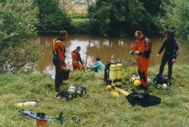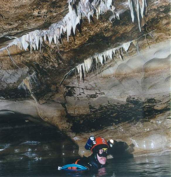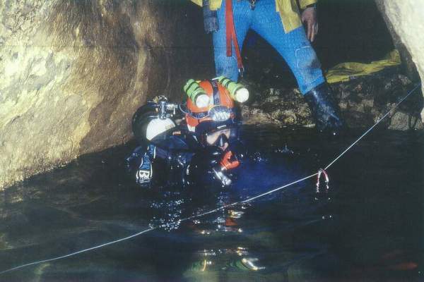 Hans Beulen a commencé la plongée souterraine en Italie où il a été dentiste pendant 15 ans. Il a même plongé à Elefante Bianco à l'époque où l'accès était encore libre. Rene Houben est de loin le meilleur plongeur souterrain que nous ayions dans ce pays. Dans la vie courante, il est plongeur commercial et il est le seul à avoir suivi une formation pour la fabrication des mélanges, ainsi, lorsque nous sommes en France, nous pouvons faire nos mélanges nous-même. Il est également le seul d'entre nous à posséder ses propres propulseurs. |