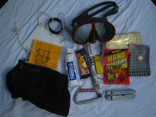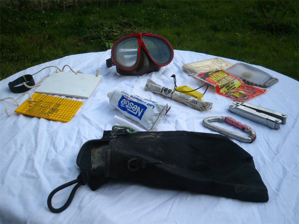Chacun a ses habitudes et ses méthodes et le contenu du "sac à main " varie quelque peu selon les individus, selon les plongées et selon les siphons.