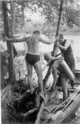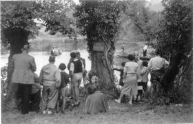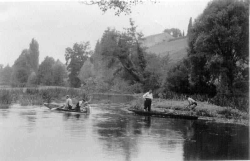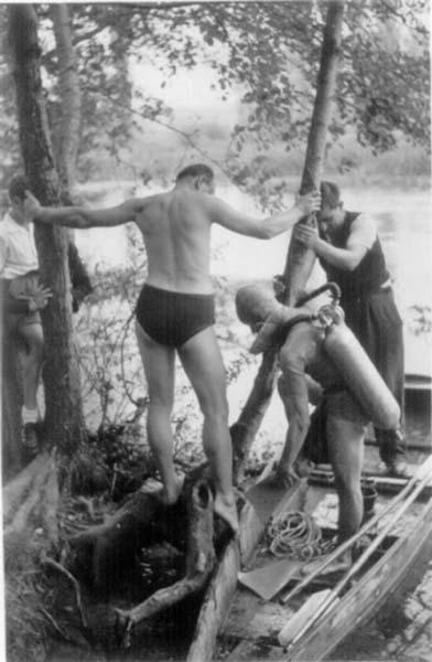 Le lundi 7 mai, après les séances d'études et de clôture, les congressistes se rendirent à la Rochefoucaud, ou un excellent repas leur fut se rvi dans la sable des Gardes du Château, aimablement prêté par M. le Duc de la Rochefoucauld. l.'après-midi fut consacré à la visite de plusieurs gisements préhistoriques sous la direction de Mlle Henri martin (Fontéchevade) et M. DAVID (Montgaudier et La Chaise). Une visite aux grottes de Rancogne, sous la conduite de plusieurs membres du Grou pement Spéléologique termina ces trois belles journées du VIII Congrès régional des Sociétés Savantes. Communications M. Philippe MONTIGNY fait le récit très détaillé des différentes plongées qu'il a effectuées dans les résurgences de la Touvre. Disons tout d'abord que ces plongées au fond des deux gouffres n'avaient jamais été réalisées et représentaient un véritable exploit à l'actif de notre sympathique collègue dont nous sommes fiers et à qui nous adressons nos plus vives félicitations pour sa har diesse et son courage. Equipé du scaphandre autonome Cousteau, M. MONTIGNY effectua une première plongée dans le fameux « Dormant » , le 28 août 1951 Rendue particulièrement pénible par la basse température des eaux, 8° à 10°, cette plongée effectuée dans la tenue ordinaire du baigneur. c'est-à-dire le simple slip, ne fut pas d e longue durée, mais permit, à notre ami, bon observateur de rapporter quelques renseignements nouveaux sur la structure de cette mystérieuse résurgence entourée d'une multitude de légendes, comme chacun sait. A une dizaine de mètres de profondeur, l'abondante végétation qui borde le gouffre, cesse complètement et laisse apparaitre les parois rocheuses de calcaire gris. Ces parois qui plongent à la verticale sont abondamment stratifiées en longues bandes horizontales fortement creusées. Certaines forment de véritables cavités, aux arêtes très arrondies usées par l'eau. Un courant puissant a dû jadis raboter et polir ces parois. L'eau n'a plus maintenant aucun mouvement sensible. Un arbre entier, entrainé au fond à la suite de l'effondrement d'une partie de la berge, git horizontallement dans cette étroite galerie rend l'exploration de cette dernière très périlleuse. Aussi. C'est très sagement que notre plongeur, transpercé par le froid, décide de remonter vers la surface. Sportivement parlant, cette descente était réussie, puisque le fond était atteint. Par la faute du froid et la présence insoupçonnée de cet arbre, aucun indice révélant l'arrivée de l'eau n'a pu être observé. Aussi Philippe MONTIGNY propose-t-il d'effectuer d'autres plongées en groupe, lorsque nos moyens financiers nous permettrons de faire l'acquisition du matériel spécial nécessaire. La plongée dans le « Bouillant », eut lieu le 10 septembre 1951. Nous laissons ici, le soin, à notre ami MONTIGNY, d'en narrer les péripéties. « Deux bateaux permettent aux « officiels » leurs observations et leur contrôle. La descente, le plus près possible du remous de la sonde lestée à quarante kilos pour résister au courant n'est pas besogne facile car les bateaux sont violemment repoussés dès qu'ils en approchent. » Par contre mon entrée dans l'eau n'est nullement pénible. Je suis muni d'une combinaison étanche qui assure une protection presque absolue contre le froid. D'ailleurs, aujourd'hui, par un caprice dont la Touvre est coutumière, l'eau est montée à 13°. C'est avec aisance et plaisir que je m'enfonce sous la surface. » L'eau du « Bouillant » est cristalline, contrairement à celle du « Dormant » et la lumière y pénètre parfaitement. Je vois au-dessus de ma tète les fonds noirs des barques et tout autour, à perte de vue, les grandes herbes courbées par le courant. Des nuées de petits pois sons s'enfuient dans tous les sens. Je nage en spirale vers le bas, les parois inclinées deviennent bientôt verticales. Le diamètre du gouffre, qui était de quinze mètres au niveau du lit de la rivière est réduit à huit mètres environ. Maintenant, plus de végétation ni de poissons. La lumière reste suffisante pour que j'aperçoive l'ensemble du gouffre à mon niveau et au-dessus jusqu'à la surface. » Les parois sont extraordinairement déchiquetées et tourmentées, des fissures profondes les coupent dans tous les sens, d'énormes dalles font des saillies et des surplombs tout autour du gouffre. J'ai l'impres sion qu'il y avait là une voûte effondrée sous la pression de l'eau ou par un cataclysme quelconque. » Emporté par mes découvertes et par l'exaltation de faire le poisson rouge, dans cet original aquarium, j'oublie de regarder où je vais et, brusquement. une giffle énorme une projette en l'air contre un sur plomb, puis me fait jaillir à la surface comme un bouchon. Je me suis approché trop près du courant. Le temps de souffler un peu, d'apprendre qu'il y a dix-neuf mètres de câble immergé, et je replonge. Je descends, cette lois prudemment, en me tenant au cible. Celui-ci est en dehors du courant et suit le fond incliné jusqu'à une grosse dalle en surplomb. Il pend ensuite librement à un mètre de la paroi nord-est et en oblique car le bateau repoussé par le bouillonnement n'est pas au-dessus du plomb. Je le suis le long d'énormes blocs inclinés qui forment cette paroi et me retrouve dans le courant. Cette fois je m'y attendais, et c'est cramponné des mains et des genoux que je m'enfonce, par un effort analogue, mais de sens inverse à celui du grimpeur de corde lisse. Deux fois la prise de mes genoux lâche et je me retrouve gigotant. les pieds en haut, le long de ma corde. Heureusement, le courant a des pulsations, je profite des accalmies relatives pour me remettre en place. Je suis si violemment secoué que l'équipe de surface - je le saurai plus tard - sent parfois la sonde soulevée du fond malgré ses quarante kilos. Je me pose enfin sur un entassement d'énormes b