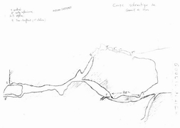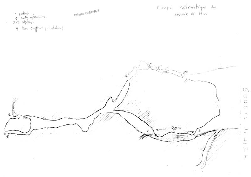 En moto avec Raoul. Les trois cartouches du 21 ont bien travaillé mais permettent de constater que le trou souffleur s'amenuise et n'est qu'une crevasse… Au siphon nous faisons des ligatures en fil de fer à nos perches et nous insinuons notre tige sous l'eau après avoir fixé à l'extrémité une lampe électrique allumée dans un bocal de verre étanche. Le procédé s'avère efficace et la lueur de la lampe se voit sous l'eau. Le niveau du lac a baissé de 3 cm depuis le 21, soit 48cm au-dessous du repère. Je me deshabille pour me revêtir de lainages, je me harnache du scaphandre, et, porteur d'un bocal contenant deux lampes électriques allumées, je m'enfonce sous le siphon en me guidant le long de la perche. Je ne suis pas assez lesté et éprouve des difficultés pour avancer et évoluer. J'arrive toutefois jusqu'à l'extrémité de la perche où la lampe du bocal éclaire toujours ; Le froid est intolérable, la visibilité assez limitée ; j'entrevois la voûte immergée, des parois accidentées. Pour aller de l'avant, je tire la perche pour la faire avancer vers l'inconnu, mais mon défaut de lest me fait trop léger et au lieu de faire progresser la perche, c'est moi qui recule… Les efforts m'essoufflent et m'obligent à dépenser beaucoup d'air. Devant l'insuccès de ma manœuvre, je me détermine à faire demi-tour, toujours en suivant la perche et la cordelle que Raoul tient sur le rivage. Je n'ai passé sous l'eau qu'une minute environ et progressé de 8 à 10 mètres. Raoul fait à son tour une plongée, mais négligeant le guide de la perche, il nage sous l'eau vers la droite, monte en surface et débouche dans une poche d'air emprisonnée sous une voûte en cloche. Il revient sans avoir entrevu de prolongement (tandis que pour ma part j'ai constaté que le champ était libre devant moi). En somme c'est une première expérience. La prochaine fois nous serons plus familiarisés et avancerons plus loin.