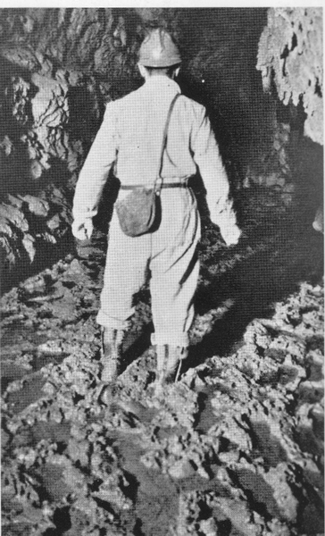 siphon. En période de crue, le trop-plein sort par cette galerie. Maurel ouvre la marche avec la lampe à acétylène, je fais serre-file, l'éclairage de Parent ne fonctionne pas. Nos vêtements nous tiennent chaud, c'est allégrement que nous barbotons dans l'eau glacée. Nous avons fait environ trois cents mètres, l'eau