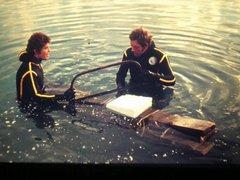 Les autres tubes on été très vite mis en place. Les planches on été rassemblées sur ce début de structure et Henri et moi avons commencé à les arrimer sur les tubes pour construire et pour former la première partie du plancher. Pendant ce temps, Pépé et Daniel finissaient de consolider le reste. Daniel avait un scaphandre de 3m 3 , aussi accomplissait t'il toutes les servitudes : aller chercher les outils au fond de la rivière, remonter des colliers, ou bloquer ceux-ci en plongée. On pensait tous que Daniel aurait assez d'air pour rentrer, même avec la seule réserve de son bloc. Et puis nous avions nos ventraux de secours.