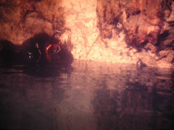 Je partais donc voir et je descendais dans le puit en solitaire. En commençant à m'engager dans le 2 ème siphon je ne trouvais pas Mickey qui aurait du être là ! Tout en pensant qu'il avait du s'engager un peu dans ce siphon, j'y allait et au final je l'ai franchi complètement, tout en pensant que mon air restant était bien pauvre ! Toujours pas de Mickey et encore moins d'Henri et de Pépé. Cette fois cela commençait à faire beaucoup de bizarreries ! Je me suis fait la rivière, en surface, pour rejoindre la nouvelle 2 ème plate-forme. Je commençais à en avoir marre, j'était crevé ! J'ai retrouvé Pépé, Henri et Mickey sur la plate-forme. Mickey avait transgressé la règle qui consiste à ne pas plonger seul (m'ayant obligé à le faire moi-même). Enfin j'arrivais près d'eux :