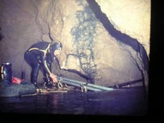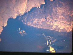Ici, la première plate-forme, juste après avoir débouché du 1 er siphon. Nous sommes dans la salle en cloche. La plate-forme n'est pas terminée, nous agrandirons le plancher et en feront un autre, un peu plus bas, pour se tenir debout. Le petit bateau gonflable, que l'on aperçoit, nous servait à entreposer du matériel, tel que des outils, scaphandres de secours, etc… Sous les eaux de ce petit lac, un passage à 8 mètres et l'autre, à 19 mètres de profondeur, nous permettant d'entrer dans la diaclase du 2 ème siphon et ensuite, la rivière souterraine que l'on voit sur la photo précédente.