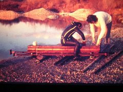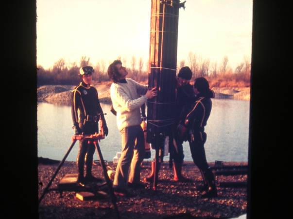 Ici, Henri P., « en civil » Derrière lui, Daniel B. Devant et de face avec un bonnet, c'est « Pépé » Yves et Henri B. en face d'Yves. Ils tiennent l'un de nos « colis » debout. On va bientôt commencer à faire flotter notre charge. En attendant, tout cela est très lourd ! Nous sommes au bord d'une gravière de Miribel-Jonnage, là où j'avais fait mes débuts, mes premières plongées, quelques années avant !!