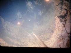 Pourquoi nous n'arrivions pas à serrer le premier vérin entre les parois ? Nous l'avons compris plus tard en y repensant. Toujours est-il que rien n'allait dans le moment présent. Lorsqu'il était en place d'un coté, il basculait de l'autre coté! Nous essayons de le bloquer entre les parois, mais le courant nous plaçait dans une mauvaise position et le vérin nous avait échappé et il fallait retourner le chercher au fond. Tout allait mal. Je soufflais comme un bœuf et mes copains aussi. Il fallait se remettre en place après avoir récupéré ce vérin. Nous pensions qu'il tenait bien et dès que nous l'agrippions pour se reposer un peu, tout retombait et il fallait tout recommencer. Un vrai paradoxe, nous étions obligés de respirer sur nos scaphandres au lieu d'utiliser nos tubas, pour reprendre notre souffle ! Je me souviens aussi du moment où je m'était agrippé à des excroissances rocheuses pour calmer ma soif d'air, sans utiliser mon scaphandre, car il fallait penser au retour au travers des deux siphons. Nous avons du nous débattre une bonne heure avant que ce sacré vérin ne soit solidement serré et ancré entre les parois de roches. Cette fois c'était bon, ça tenait bien. On s'est suspendus tout les quatre sur ce vérin, la tête hors de l'eau et, en silence, on reprenait notre haleine ! Seule la lueur blafarde d'un phare qui commençait à en avoir marre, nous éclairait. On économisait le reste de la lumière pour rentrer !!