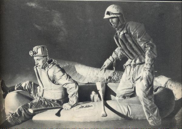 Charvoz ( 1 ), et Rebikoff, qui se sont équipés entre temps, se préparent à plonger à leur tour pour se familiariser avec le siphon et tenter de prendre quelques photos.
