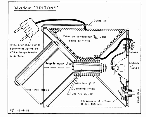 Le fil est relié au phare par deux bornes facilement accessibles. Ces bornes permettent au p'ongeur, dans le cas des siphons très longs ou tortueux, de séparer le fil de la bobine et de ramener celle-ci sans difficulté. Le fil est ensuite tiré sur la berge.