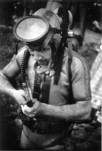 Les appareils de plongée COUSTEAU, mis au point pour les plongées en mer, doivent subir quelques modifications pour être adaptés à la plongée en siphon. Un des points les plus importants est la facilité de transport. Dans beaucoup de cas, les bouteilles de 4 litres, type COMMEINHES, donnent une autonomie suffisante. |