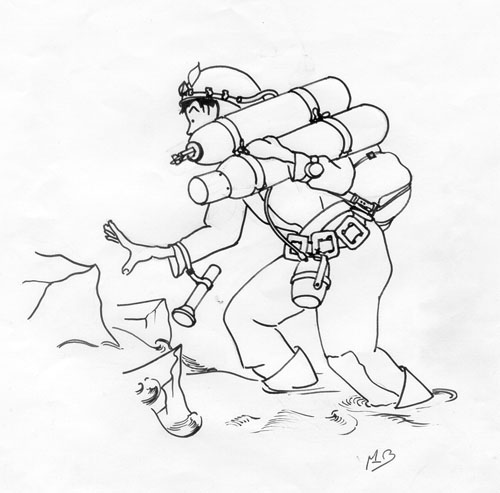 Il est bon de revêtir, sur cette combinaison étanche, un vêtement de forte toile qui la protègera du contact direct des roches.