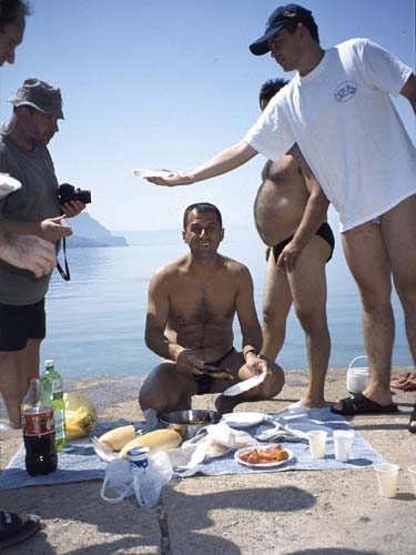 Une plongée à quatre nationalités dans un lac-frontière. Août 2000, république de Macédoine. Ce petit pays continental, situé au sud-est de ce qui fut la Yougoslavie est situé en plein cœur de la péninsule balkanique. Et pourtant…. Lac d'Ohrid, 695m. d'altitude. Sur l'autre rive, l'Albanie se reflète sur la surface, miroir immaculé que nul clapot ne vient rider. Ici, au soleil et dans l'eau à 24°C., nous avons tôt fait de donner la mesure. Ici, au régime du langage des signes, finis les problèmes de communication. Tout le monde parle la même langue, oubliés les problèmes de compréhension, de traduction, d'interprétation. Le voilà de retour, triomphal, une belle couleuvre à la main. Quelques clichés immortalisent la scène. Nous terminons la plongée par la visite de « Micograd », la ville de Mico. Cette cité lacustre antique est l'un des principaux sites archéologiques sous-marin de Macédoine, actuellement en cours de fouilles dans le cadre d'un chantier national. Et on comprend pourquoi : par trois mètres de fond, les poteries foisonnent. A l'heure où j'écrivais ces lignes, alors qu'une nouvelle expédition, prévue pour aout 2001, était sur pieds, un conflit armé éclatait en Macédoine. Quelques soixante ans après les ambitions d'un petit brun moustachu germanique, la bête immonde vit toujours…Aujourd'hui, c'est plus le silence que le bruit des bottes qu'il faut craindre. |