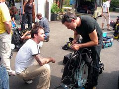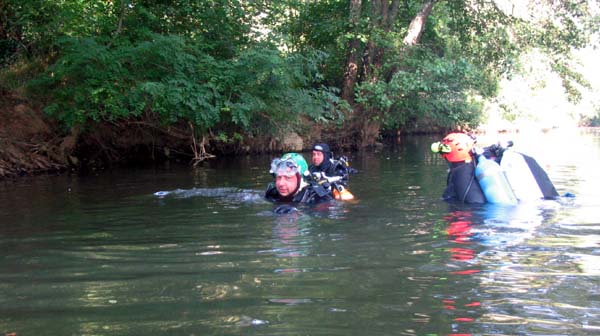 J'ai commencé la plongée subaquatique il y a un an et demi environ, je pratique en club en Normandie. La plongée souterraine, comment je me suis fais piquer ou comment ais-je attrapé le virus ? Je faisais des recherches sur le net, sur la plongée et je suis tombé sur des articles de plongée spéléo. Tout de suite cela m'a alerté par le matos que les mecs utilisaient ! On aurait dit des astronautes ! Le côté « exploration » me semblait prendre son véritable sens dans cette discipline, à la lecture des articles, la technicité, le côté un peu « tribal » de l'activité et des personnes qui la pratiquent, la condition mentale encore plus exigeante… J'étais vraiment attiré par l'ensemble ! (Je sais que ce n'est pas le seul en la matière…) Mais son record du monde de profondeur m'intriguait et je souhaitais rencontrer le personnage. Je lui ai envoyé un mail et il m'a rappelé carrément ! Je ne pensais pas qu'il était autant disponible vu son emploi du temps…On a pas mal discuté, j'étais encore niveau 1 fédé et je m'entraînais pour mon niveau 2 que j'obtins par la suite. Alors, on cale le week-end avec Pascal en septembre 2007 et je motive quelques potes de mon club pour un stage d'initiation à la plongée spéléo : finalement, on est cinq à partir ! On taxe le camion du club et nous voilà parti tous ensemble dans le Lot. Mais déjà, dans ma tête, je prenais ce stage plus comme une première étape dans le processus de formation qu'un stage de découverte…Je sentais que ça allait me plaire mais fallait que j'essaie pour en être certain ! Le stage se déroule sur 3 jours complets et au total on est un groupe de 12 à suivre la formation ! 2 élèves par moniteur. Tous les matins, on voit les cours théoriques et la pratique mais à terre ! Ce que j'ai trouvé excellent pour apprendre à se familiariser avec le matériel et commencer à manipuler. La première plongée du vendredi, direction la vasque de St Sauveur ! Le site est magnifique ! Ce qui me séduit littéralement, c'est le fait de s'équiper à moitié dans les bois pour aller plonger ! D'habitude, c'est sur un bateau en mer… Je plonge avec Sonia (qui au passage est absolument ravissante…) mais on ne pénètre pas dedans…on reste à l'extérieur à dérouler du fil et progresser avec etc…Donc pas un franc contact avec le monde souterrain. Ceci dit cela permettait de se faire la main avec la wing, le bi, le dévidoir etc…C'était ma première fois avec tout ce matos sur le dos ! Donc on va dire une approche en douceur… Le lendemain, les choses sérieuses commencent…direction l'émergence du Ressel. Le site est toujours tout autant séduisant, une petite route qui longe la falaise comme ça rappelle un peu les gorges du Tarn, les vacances…Seulement Joël (Joël PRAX) est là pour nous rappeler le déroulement de notre future plongée et je dois dire que cela nous a replongé dans le vif du sujet… Au programme, progression jusqu'au « Y » maximum (environ 180m je crois) et au retour un petit exercice : simulation de perte de fil avec la technique du lasso. On s'équipe, on se met à l'eau, on palme en surface sur quelques dizaines de mètres jusqu'à apercevoir un fil d'ariane amarré sur un arbre au dessus de la surface et qui plonge dans l'obscurité…Jusque là tout va bien, on amorce la descente, je ne sais pas à quoi ça ressemble, on est le dernier groupe à partir, et lorsqu'on arrive devant l'entrée, un mur de touille ! Les copains qui étaient passés devant… Tout à coup, le stress monte d'un cran, je ne lâche pas le fil, je colle de près mon pote Romuald, je ne le vois pas, je distingue à peine le bout de ses palmes et là je me dis, tu ne le perds pas de vue, tu lui colles au train !!! C'est comme ça sur quelques mètres et enfin, soulagement, délivrance, on y voit clair !! Impressionnant ce changement radical de visibilité ! Lorsqu'on se reprend un peu en arrivant à l'intérieur, mon cœur bat la chamade ! Je me calme, reprends un peu mes esprits…mais quelle entrée en matière ! Nous voilà parti tranquillement dans le Ressel, le spectacle qui s'ouvre devant moi est extraordinaire ! J'en reviens pas tellement je trouve ça beau ! A ce moment là, je ne voudrais pas être autre part que dans le Ressel avec mon casque et mon bi sur le dos !! On arrive au « Y » qui signifie qu'on doit faire demi-tour…J'aurai bien continué encore un peu voir beaucoup même…J'me sens trop bien, j'ai du dialogue interne, j'me sens euphorique…un début de narcose ??? NON, seulement trop content d'être là punaise !!! On est sur le retour, je prends bien soin d'alterner mes détendeurs afin de conserver la même conso dans chaque bloc ! A 50m de l'entrée, les autres avant nous ont fait des exercices…Et nous voilà encore face à un mur de touille mais ce dernier m'impressionne moins que le précédent… On pénètre dedans, on stoppe la progression à environ 40m de l'entrée et là Joël me fait signe de ne pas bouger et de ne pas lâcher le fil. Ce dont je m'attèle avec vigueur… Il prend Romuald avec lui et ils s'évanouissent dans la touille, je ne les vois plus du tout…ils sont partis faire l'exercice du lasso ! (on avait été brieffé, on ferai l'exercice les lumières éteintes, le masque retiré, les yeux fermés, enfin fermés ou ouverts, là ça changeait rien…) Et là, d'un coup, je prends conscience que je suis seul, dans la touille…alors j'me suis dit, puisque je n'y vois rien, j'vais éteindre les lampes de mon casque pour voir un peu ce que ça donne : clic clic, je suis dans le noir maintenant ! Lollllllllllllllllllllllllll Et j'ai attendu comme ça un certain moment qui m'a paru assez long tout de même… Il me semble distinguer une lueur, oui, les voilà qui reviennent vers moi ! C'est à mon tour ! C'est parti ! J'éteins mes lumières, je retire mon masque, et Joël qui m'avait indiqué un point d'amarrage me surveille de près,