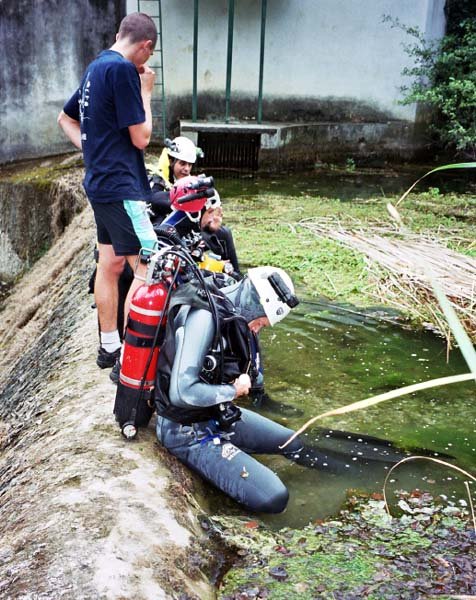 Après avoir remonté la rivière à la palme sur environ 50m, le moniteur me montre un fil attaché à une branche surplombant la berge et me dit " tu n'as plus qu'à le suivre.... " En regardant vers le fond, à travers une eau limpide comme de l'Evian, je vois disparaître cette petite ficelle entre de belles algues vertes camouflant la sombre entrée de la résurgence barrée par un tronc d'arbre mort. Après être entré dans le trou, il me vient une grosse montée d'adrénaline suivie d'une grosse angoisse lorsque je réalise que j'ai un plafond au-dessus de la tête, je me demande alors pourquoi je fais ça, pourquoi je suis ce fil d'Ariane qui me conduit je ne sais où et qui seul me permettrait de retrouver la sortie ? Je me rassure assez vite en pensant au matériel que j'ai sur le dos : 2 bouteilles indépendantes, 2 détendeurs, 2 manomètres. Si un système merde, il me reste toujours l'autre, pour me rassurer je m'imagine être un vrai sous-marin complètement autonome, quoiqu'il arrive.... Au fond du trou, 6m plus bas, je vois la galerie se rétrécir et partir à l'horizontal, c'est là que le fil m'emmène, la lumière du jour n'y sera bientôt plus qu'un souvenir. Passée la première étroiture, le faisceau des 2 lampes montées sur mon casque s'écrase toujours sur une paroi minerale quelle que soit la direction dans laquelle je les oriente.... Seule la contemplation du milieu me permet d'oublier, brièvement hélas, mon angoisse. Le halo bleuté du puissant phare HID du moniteur qui me suit projette mon ombre sur les parois découpées et me rappelle que je ne suis pas seul. Fausse idée car il m'avait mis en garde : " en plongée spéléo, même si on plonge à plusieurs, aucune assistance n'est possible, pas d'échange d'embout, rien, tu es 100% autonome, tu te débrouilles ! " Après une trentaine de mètres parcourus dans un boyau minéral sinueux, on atteint le point bas du siphon à -13m juste après une sérieuse étroiture. De là remonte une cheminée presque verticale. Ce premier mouvement dans le sens des bulles me rend instantanément euphorique car je m'imagine déjà percer la surface. Faux espoir, plus haut le boyau repart aussitôt à l'horizontale puis redescend. 40m plus loin, la galerie s'élargit et en regardant vers le haut, j'aperçois enfin le reflet de mes lampes sur une grande flaque argentée, enfin la surface, nous avons passé le siphon et pourrons bientôt sortir la tête de l'eau et communiquer !!!! Ce siphon est connu, il n'est pas dangereux d'y respirer l'air de la partie exondée, ce n'est pas toujours le cas dans les autres.... Nous n'avons parcouru que 70m en distance déployée et pourtant je me sens si loin du monde, heureusement la présence de gros tuyaux de captage dans la cloche traduit le fait que d'autres hommes sont même venus travailler dans cet endroit égaré, ca me rassure. On discute un peu avec le moniteur, nous faisons de la buée en parlant, il fait froid. Lui aurait envie de poursuivre dans le 2ème siphon mais ce n'est pas au programme, nous choisissons le sens de la sortie. Au retour, l'eau étant restée claire après notre passage, il m'autorise à lâcher le fil à condition de le " tenir du regard ". Je me sens enfin en confiance, je savoure et prends mon temps, c'est un régal pour les yeux : des failles immenses et étroites disparaissent dans les méandres du boyau et resteront pour toujours inexplorées.... Bien qu'il soit difficile de se repérer dans ce siphon, l'arrivée dans la cheminée m'indique la moitié du parcours, je m'y laisse tomber le plus lentement possible en laissant glisser mes mains le long de la paroi rugueuse. En bas, je prends mon temps pour passer l'étroiture, je vide mes poumons pour me rapprocher le plus possible du fond, je replie les bras sous le ventre et me laisse glisser lentement, sans respirer, en écoutant attentivement le moindre bruit que pourrait produire le contact de mes blocs et de mes détendeurs avec la roche. Une fois de l'autre coté, je me retourne et attends le passage du moniteur, vision fabuleuse : seul son faisceau est d'abord visible, il permet de distinguer nettement, à contre-jour, le profil dentelé de l'étroiture. Ensuite apparaissent lentement son casque, ses épaules puis son scaphandre tout entier. C'est une vision à couper le souffle, je me dis que j'ai de la chance de pouvoir admirer ça de mes propres yeux.... Bientôt j'aperçois au loin une douce lueur étonnament fixe, je comprends que la sortie est proche et je regrette déjà. Un bouillonnement sourd attire mon attention, ce sont les bulles de nos scaphandres qui roulent au plafond en se dilattant, je m'arrête un instant et contemble ébahi les rayons de soleil qui transpercent ce bleu unique et viennent éclairer les premiers rochers qui ne se trouvent plus maintenant qu'à quelques mètres devant moi, de nulle-part ré-apparaissent quelques poissons qui avaient disparu avec l'obscurité. En perçant enfin la surface, je ne sais pas quoi dire pour décrire ce que j'ai vu et ce que j'ai ressenti, je suis presque étourdi par tant d'espace et de lumière. Je lève les yeux et regarde le soleil, les nuages et je n'en reviens pas, nous ne sommes restés que 14min dans ce trou et pourtant c'est comme si je voyais le ciel pour la première fois. |