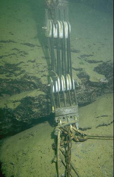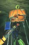Inconvénient majeur de la solution retenue, pour manoeuvrer le palan il faut être en pleine eau. C'est le travail qui incombe aux plongeurs d'assistance. Pour un plus grand confort d'utilisation, sous la cloche nous avons installé un treillis métallique réglé de telle façon que debout, nous ayons le buste dans la cloche.