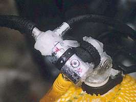 Le système de protection anti-givre employé par la marque suédoise depuis plusieurs années est un capuchon en caoutchouc qui protège la membrane et le ressort du premier étage. Selon le fabricant, ce capuchon doit être rempli de glycol (mélange de 50% de glycérine et de 50% d'alcool) ou de Vodka ou de toute autre liqueur à fort taux d'alcool. Remplir ce capuchon est plus facile à dire qu'à faire et cela demande pas mal d'habileté. D'autre part, les capuchons, assez fragiles, peuvent se fendre et se vider facilement sans enlever la protection latérale. C'est une rupture de stock qui nous a obligée à tester les deux Jetstream sans capuchon, l'un ayant percuté le plafond d'une grotte en plongeant avec une configuration dorsale et l'autre perdu en plongeant avec une configuration latérale.