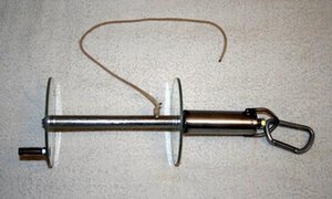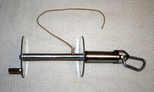 Tout est en acier inoxydable pour pouvoir l utiliser aussi en mer. Les dimensions des flasques et la hauteur peuvent varier, la contenance sur celui-ci est d environ 200 metres de fil de 3mm. Le diametre de la poignee est assez grand pour eviter les crampes, l axe de la bobine doit etre suffisament grand pour permettre de devider sans difficultes les derniers metres de fils. Materiel :