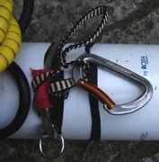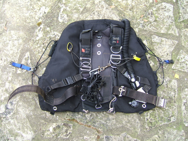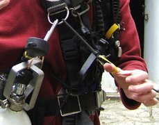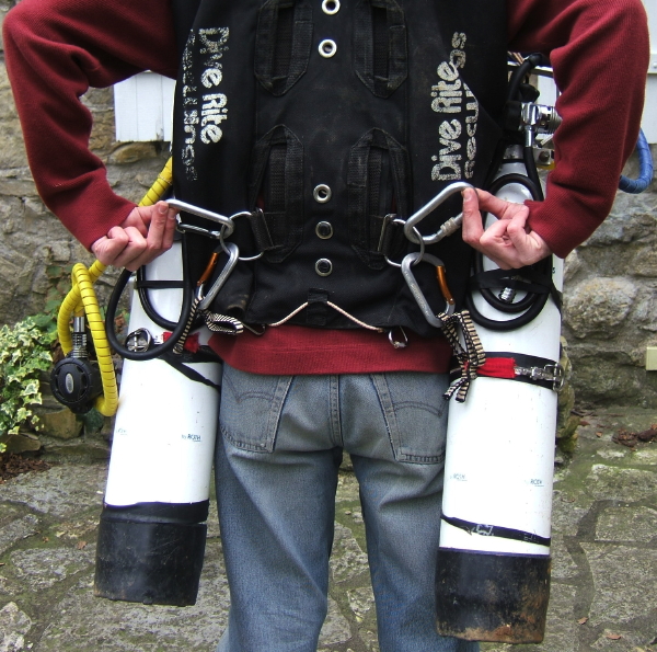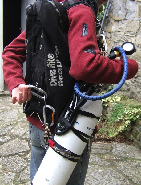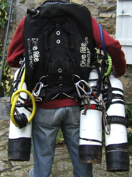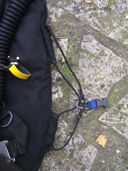 -J'ai récemment remplacé DIVERS / PETIT MATERIEL: -Pour la fixation des blocs, tous ont un bout de "Daisy chain" d'escalade (photo 13) = deux longueurs de fixation. Ca permet une fixation qu'on peut couper si besoin. Les deux longueurs permettent d'allonger la fixation facilement sous l'eau : le bloc "pendra" alors un peu plus, presque en ventral -pas forcément indispensable, je l'ai monté ainsi pour un siphon en diaclase étroite où les blocs strictement en latéral raclaient sur les cotés (une étroiture à l'entrée interdit le dorsal dans ce réseau). -Il me semble que le confort de la configuration dépend beaucoup du point d'attache sur les blocs : les cerclages sont bien positionnés lorsqu'ils se situent approximativement au centre de gravité des blocs (en les tenant par la Daisy Chain, ils pendent à l'horizontale). -En bas du harnais sur le dos, deux élastiques ont été ajoutées, et permettent d'y accrocher dévidoir, boyon du phare, petit matériel... -Sur chaque bloc, un anneau sur le cerclage permet aussi de fixer du matériel (pochette post-siphon par ex). -La sangle d'origine entre les bretelles, peu fiable, a été remplacée par un maillon rapide où sont fixées quelques caouèches (photo d'ensemble).