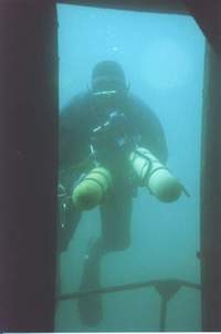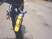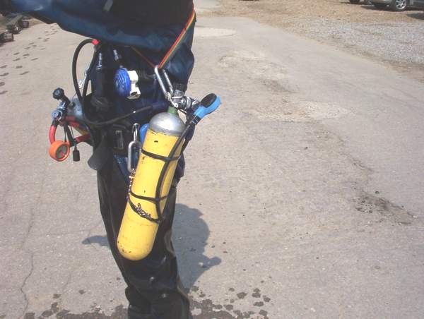 Ce type de portage des bouteilles est dédié aux siphons courts et étroits. Le principal intérêt de cette configuration est de permettre d'attacher et de détacher facilement les blocs. On ne peut pas utiliser le harnais et la bouée habituelle car le passage où il faut entrer est trop petit. On utilise alors une ceinture spéciale. Les blocs sont accrochés à deux endroits : à la taille sur une ceinture, et à la poitrine.