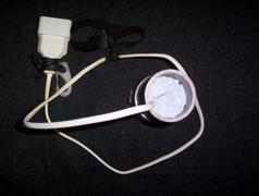 Un petit morceau de plastique dur de 3mm de forme arrondie, pour bien englober le dessus de la main, percer sur les quatre angles afin d'y glisser nos petits bouts magiques de chambre à air. Et pour fixer la lampe une accroche tube situé sur le centre.