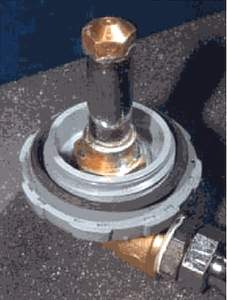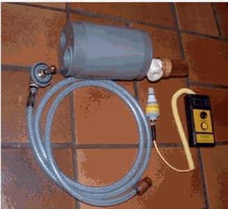 L’injection d’oxygène : Donc la buse est brasée sur un raccord laiton de ¼ gaz qui traverse un bouchon vissé en PVC de 40 qui vient se loger dans un des trous du bouchon du haut (voir photo). L’oxygène arrive sous pression grâce à un tuyau souple qui provient du détendeur de chalumeau. Le détendeur permet d’ajuster la pression, donc le débit d’oxygène. |
