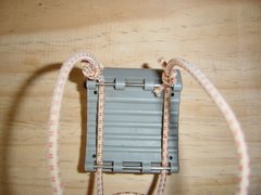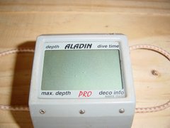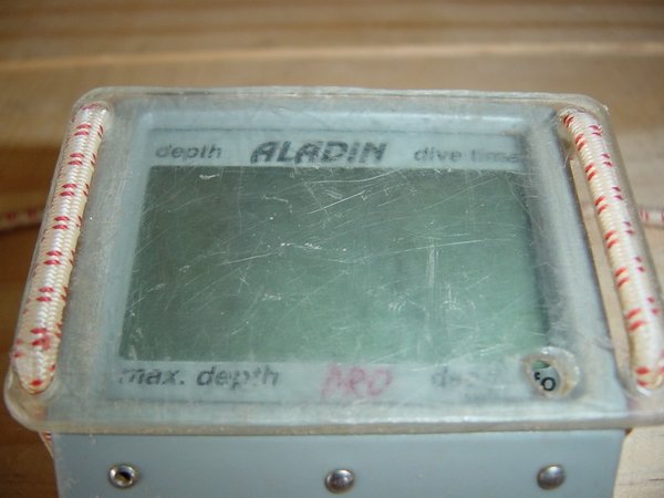Quelques modifications apportées a cet ordinateur pour l'usage un peu « costaud » en plongée souterraine. La réputation de robustesse du bracelet d'origine n'a pas du dépasser les murs du bureau d'étude d'Uwatec en Suisse… C'est pourquoi, je l'ai remplacé par des élastiques 4 mm achetés en magazin d'accastillage. 2 boucles indépendantes avec nœud de pêcheur simple qui sont passées sous les tiges inox du capot arrière. Ces tiges se démontent avec un chasse goupille fin et un marteau. Une des 2 boucles a un diamètre légerement superieur a l'autre pour mieux épouser la forme conique de l'avant bras ( juste un peu maniaque parfois…). En cas de rupture d'une des tiges ou de l'un des élastiques, vous ne perdrez pas l'ordinateur, ce n'est pas le cas pour la rupture du bracelet d'origine… L'inconvenient reste que ce n'est plus réglable… Mais j'ai peu de différence de grosseur entre l' étanche et l'humide avec une sur-combi speleo. 2° modif, l'ajout d'un protecteur d'écran. Celui-ci a été réalisé dans une chute de polycarbonate épaisseur 3 mm. Les dimensions sont de 75 x 50 mm avec 4 percages aux angles, une boucle en élastique vient « ceinturer » l'ordi. Un percage sur le bas de l' écran pour que l'eau puisse s' échaper, ça évite la formation de bulles entre l' écran et le protecteur et ainsi gêner la lecture. Sur les photos, on voit que le protecteur est bien rayé, mais sous l'eau les rayures ne se voient plus.