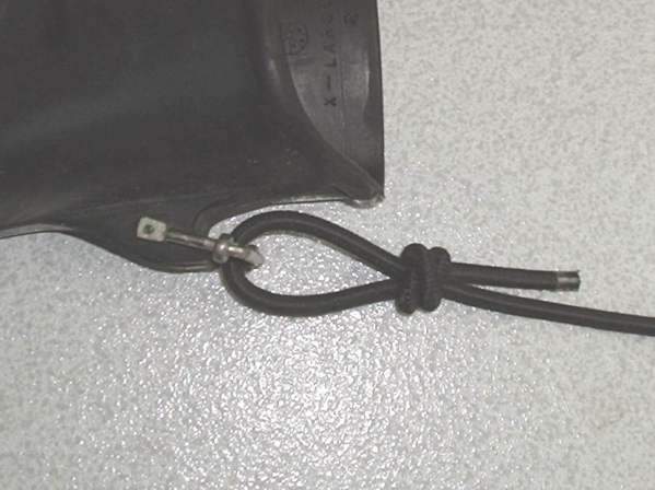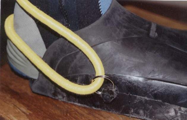 Initialement, on utilisait une " longe ". Un morceau de cordelette fixé à la palme d'un côté, à un anneau de chambre à air de l'autre. L'anneau, passé autour de la cheville du plongeur, solidarise la palme avec sa jambe. Il peut la retrouver en cas de rupture de sangle ou de la fixation pour effectuer une réparation ou un bricolage à l'air libre si une surface est proche, mais difficilement l'utiliser pour se " rapatrier " si le siphon est long.