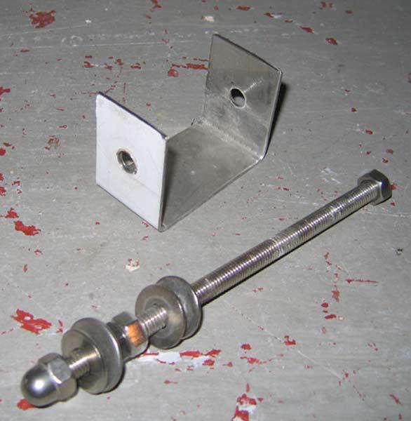La liaison avec la plaque de la wing est faite au moyen de deux lamelles en inox de 1.5 mm d'épaisseur pliée en forme de U. La base du U faisant 6 cm et vient donc s'insérer dans la largeur de la poutre. Les côtés de la pièce en U sont perforés pour laisser passer la tige en inox de 8mm, qui sert à boulonner le tout sur la pièce inox.