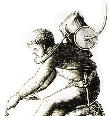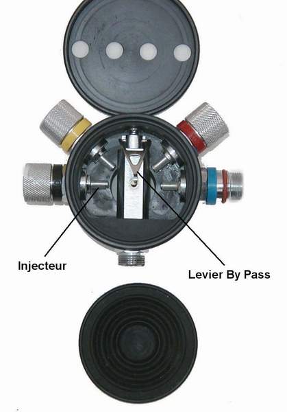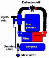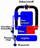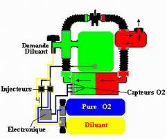 à circuit fermé : à injection manuelle C’est la technique d’injection la plus simple. Elle consiste à actionner manuellement un levier ou un bouton poussoir afin d’introduire la quantité d’oxygène souhaitée par le plongeur dès que l’inspiration se fait difficile. Difficile l’inspiration ? Précisons qu’en s’immergeant le plongeur éprouve immédiatement le besoin d’injecter du gaz dans les faux poumons qui s’écrasent sous l’effet de l’augmentation de la pression ambiante. Cette situation se renouvelle à chaque augmentation de la pression ambiante. à injection automatique L’évolution technique consiste à remplacer