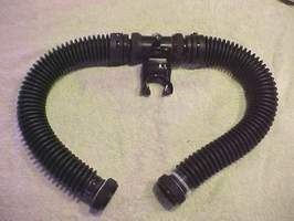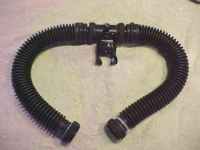 et l’embout : Premiers composants de la boucle, ils permettent de récupérer le gaz qui vient d’être expiré par le plongeur. Aujourd’hui, la plupart des constructeurs s’accordent sur la technique éprouvée d’un tuyau annelé d’inspiration et d’un tuyau annelé d’expiration. La forme modelée (canules) des tuyaux est destinée à prévenir leur écrasement et à permettre les mouvements de la tête. Ils sont montés autour d’un embout équipé de soupapes anti-retour. Elles permettent ainsi une circulation du gaz en sens unique pour ne pas mélanger le gaz chargé de CO2 avec celui qui vient d’en être épuré, après son passage au travers de l’absorbant de CO2. Même si des détrompeurs mécaniques et des repères de couleur sont prévus afin de ne pas se tromper lors du montage après un entretien, une vérification avant la plongée est très fortement conseillée. Un dispositif permet de fermer l’embout de manière à éviter toute entrée d’eau si celui-ci venait à être retiré en immersion. |