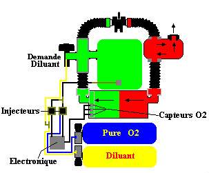 Ces appareils ont la caractéristique de délivrer l’oxygène en maintenant une pression partielle constante d’oxygène. Techniquement, cet ajout se réalise de manière chronométrée à l’aide d’une électrovanne. Ce système "temps réel" permet de réguler la ppO2 à un seuil prédéfini appelé "setpoint". C’est le domaine du " sur mesure " : on travaille uniquement par différence en injectant seulement ce qui manque d’oxygène pour atteindre la valeur programmée. On fabrique le mélange en fonction des besoins et des efforts. De là à dire qu’il s’agit d’une usine à gaz, il n’y a qu’un pas ! En théorie, c’est l’appareil idéal car en maximisant la ppO2 on diminue d’autant les pressions partielles des gaz inertes qui influent sur la décompression. Par contre, la mise en oeuvre est complexe et les solutions utilisées sont peu compatibles avec l’élément liquide : l’électronique et l’électricité (après les appareils photos et les ordinateurs, c’est le tour des recycleurs ...). Mais pour tout ceux qui utilisent ce type de matériel il faut reconnaître que la performance est au rendez-vous et est assez surprenante. l’injection pilotée par électronique : On trouve donc dans ces appareils :