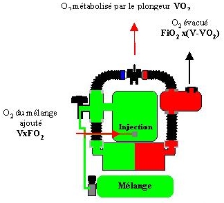 du mélange fourni Pour un Dräger Dolphin qui utilise un Nitrox 32, le débit prédéfini est de 15,5 L/min. Puisque à un instant donné, on considère qu’il y a équilibre entre ce qui rentre et ce qui sort du recycleur : Ce qui rentre = ce qui sort : V x FO2 = FiO2 x (V-VO2) + VO2 |
