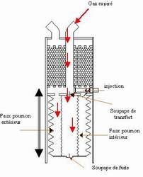A l’expiration : Lorsque le plongeur expire, le gaz remplit le faux poumon extérieur et le faux poumon intérieur (via la soupape de transfert). L’ensemble augmente donc de volume mais aucun gaz n’est évacué. Rappelons que, comme souvent avec les recycleurs, la technique du poumon ballast, chère aux plongeurs en circuit ouvert, est purement et simplement supprimée.