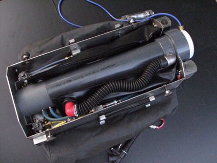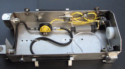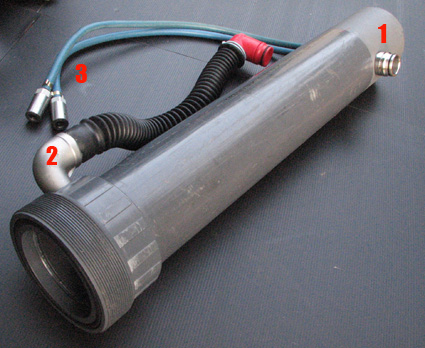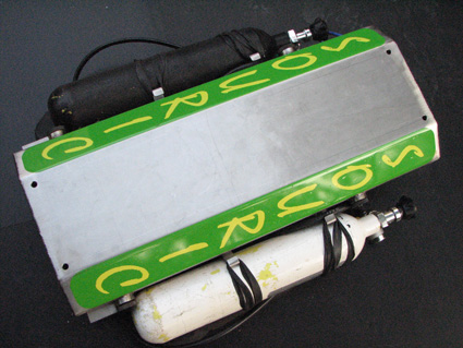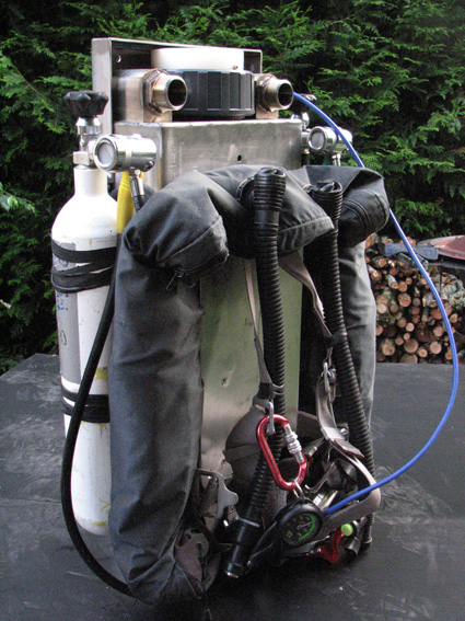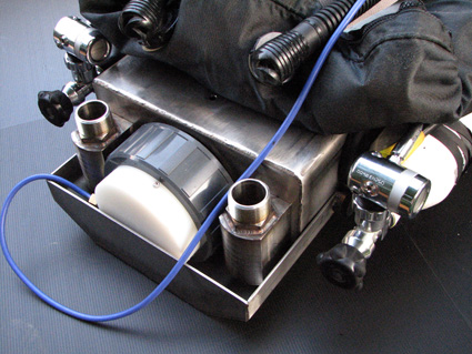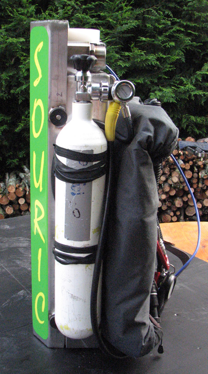 L'objectif était de concevoir et réaliser un recycleur CCR dorsal robuste, adapté à la plongée souterraine. Le principe de fonctionnement est un circuit fermé, basé sur le principe d'injection continue d'oxygène de type "KISS". Description: Le SOURIC intègre ses composants dans un caisson métallique: Canister, faux-poumons, mais aussi et surtout les vannes d'injection d'O2 et diluant, augmentant ainsi la fiabilité en éliminant tout risque d'endommagement des flexibles lors de franchissements de passages étroits.