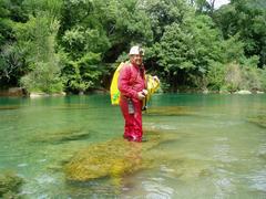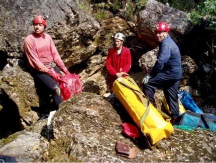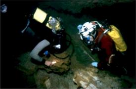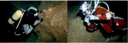 Le piégeage donne de très bons résultats en milieu troglobie où l'appât attire les espèces qui s'en nourrissent, lesquelles attirent ensuite leurs prédateurs... Ce n'est pas une méthode habituellement utilisée pour mollusques souterrains. Un piège a été déposé à Rodel aval, appâté avec de la viande de cheval (qui semble donner de bons résultats, voir notamment le manuel du projet PASCALIS, cf. biblio). Seuls des Niphargus (Niphargus cf. virei) ont été récoltés. Les prélèvements en plongée ont été effectués à la Folatière et à la Tuiède par la fine fleur de la plongée souterraine parmi les membres de la FFESS. Bien que très aléatoires, ces prélèvements sont intéressant dans la mesure où on ne possède aucune donnée sur la bathymétrie pour ces animaux. A quelles profondeurs peuvent-ils survivre ? La profondeur est-elle un obstacle à la dispersion des populations ? Où dans les rivières souterraines sont-ils les plus abondant ? Traitement des échantillons : Les échantillons prélevés en milieu aquatique sont d'abord immergés quelques jours dans l'espoir de voir remonter des individus vivants. Les individus peuvent être suivis à la trace dans le sédiment Le sable est ensuite bien séché et plongé à nouveau dans de l'eau. Le surnageant est alors versé dans un filet à mailles fines (500 microns). Les coquilles qui flottent sont ainsi collectées dans un petit volume de sédiment. Conservation des échantillons : Toutes les coquilles sont conservées en collection. Des individus récoltés vivants ont été conservés en alcool pour des études anatomiques et ou génétiques. D'autres ont été mis en aquariums dans l'espoir de les maintenir vivants et d'observer des éléments d'écologie et de biologie (comportements, ou événements comme la reproduction).