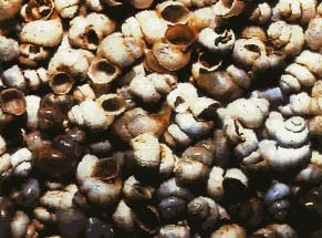 La plupart de nos gastéropodes aquatiques troglobies7 appartiennent à la famille des Hydrobiidés8, largement répandue dans les sources et ruisseaux d'Europe. Il s'agit de gastéropodes, donc de mollusques, appartenant à la sous-classe des Prosobranches 9 qui rassemble la très grande majorité des "escargots" aquatiques, de mer ou d'eau douce. Pour les amateurs de détails, ce sont des Mésogastéropodes10 qui n'ont conservé, par suite de l'enroulement, qu'une seule oreillette au cœur, une seule branchie, un seul rein...