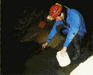 Si le dépôt est constitué de sable sec, ne pouvant contenir que des coquilles mortes, des sacs en plastique assez solides suffisent. S'il y a espoir de ramener des individus vivants permettant une étude biologique plus riche, il faut utiliser des bidons étanches et conserver un mélange de sédiment et d'eau. Dans le cas d'une sortie spéléologique ordinaire, on les disperse au fond des kits des participants tandis que, pour une visite spécifique, on se charge au maximum. Pour mémoire, un bidon de 3,5 litres plein pèse 9 à 10 kg, un de 61 de 15 à 17 et, si on en met deux, ça fait 30 à 35 kg à remonter. |